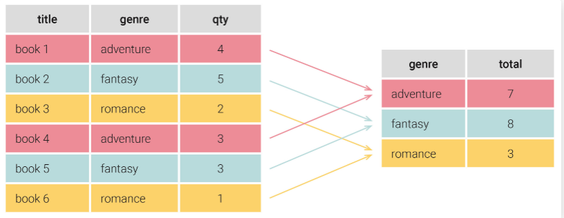 예를 들어, 밑에 사진처럼 장르별 책의 개수를 구하고 싶다면 GRUOP BY와 SUM 함수를 사용하면 됩니다.