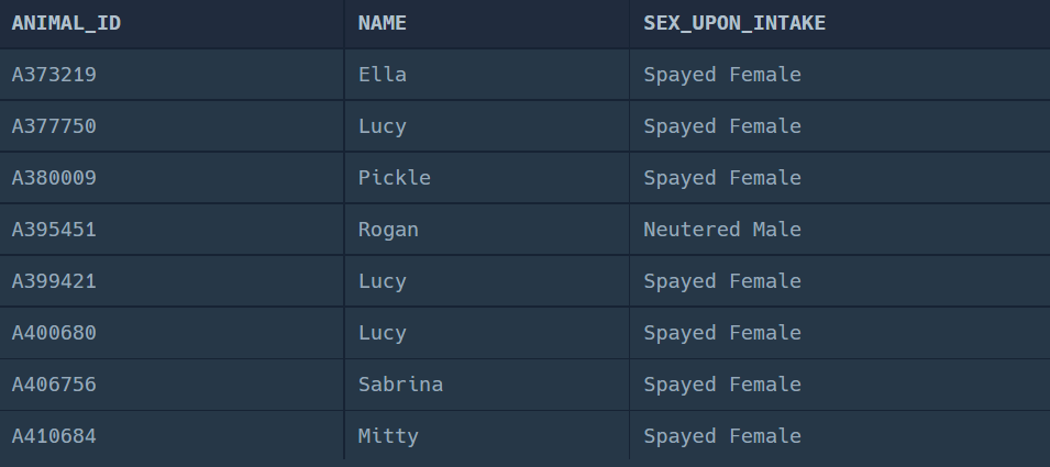 SELECT ANIMAL_ID, NAME, SEX_UPON_INTAKE