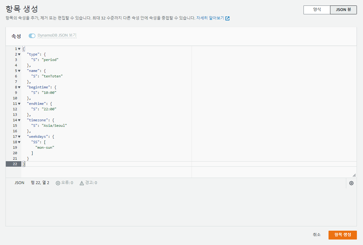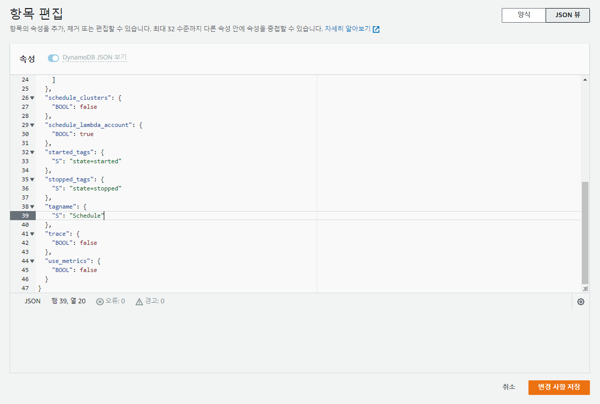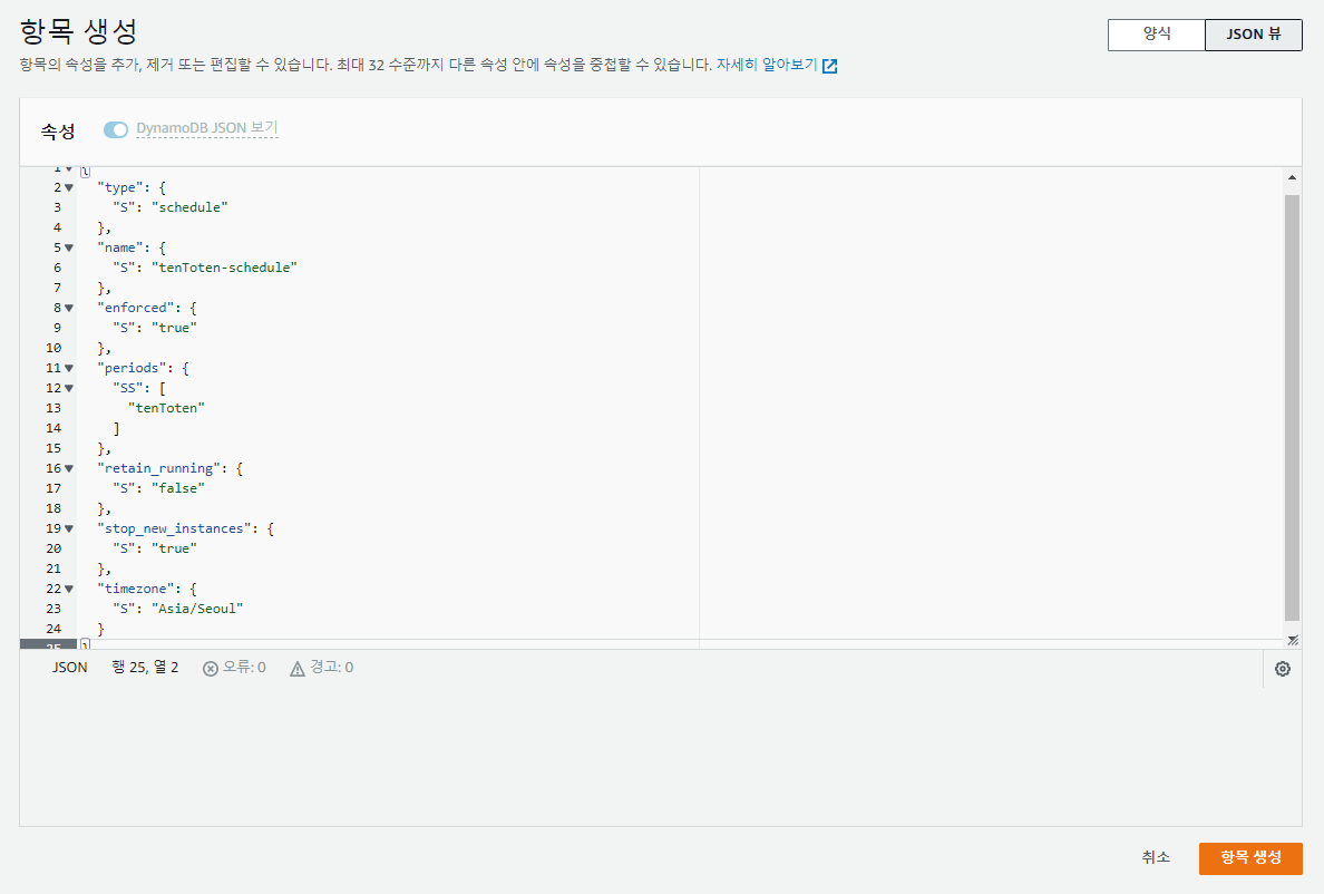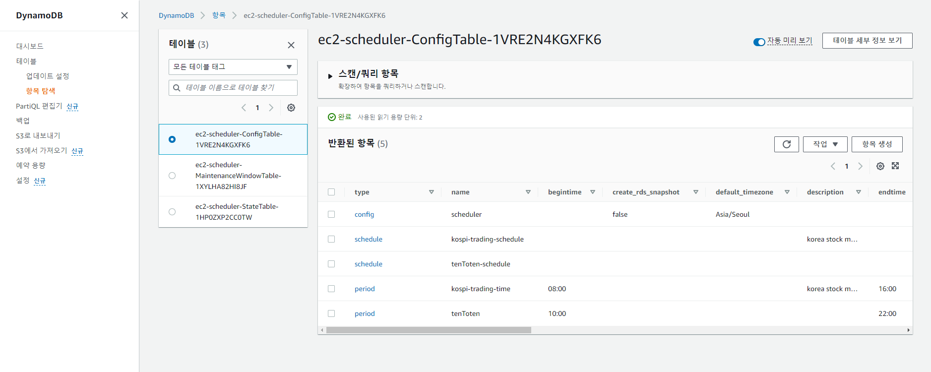 스택을 생성하게 되면 DynamoDB에 스케줄러 세부 설정을 할 수 있는 테이블이 자동으로 생성됩니다.