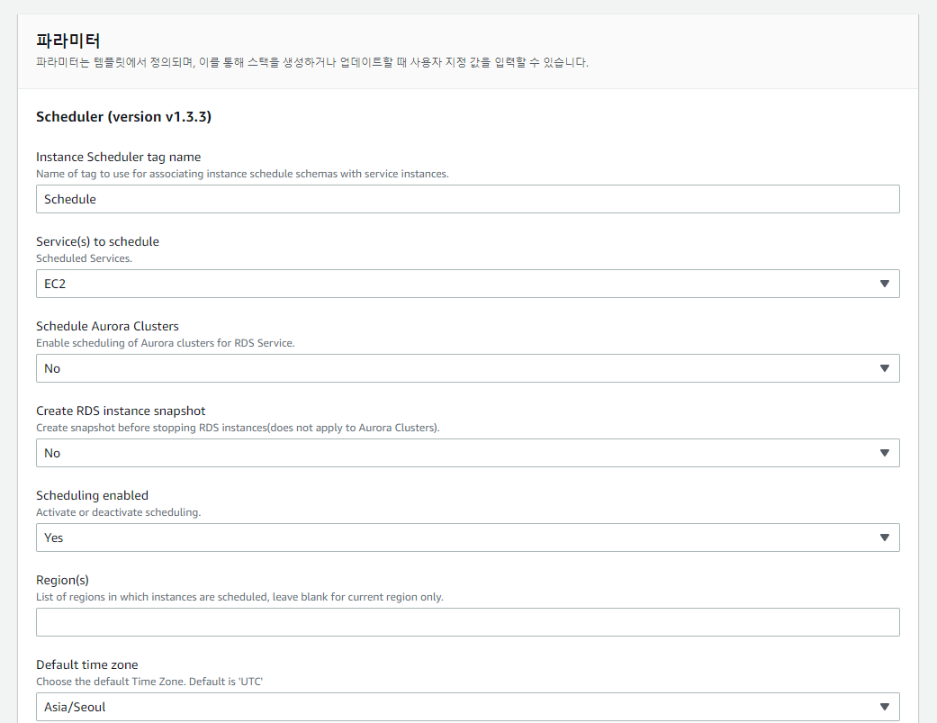 begintime, endtime, weekdays을 설정해줍니다. 차례대로 인스턴스 시작시간, 종료시간, 요일입니다.