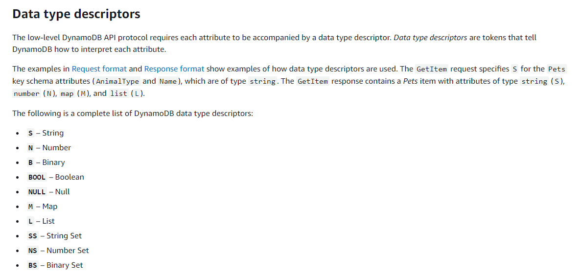 DynamoDB 데이터 형식에 따르면 S는 String, SS는 String Set 자료형을 의미합니다.