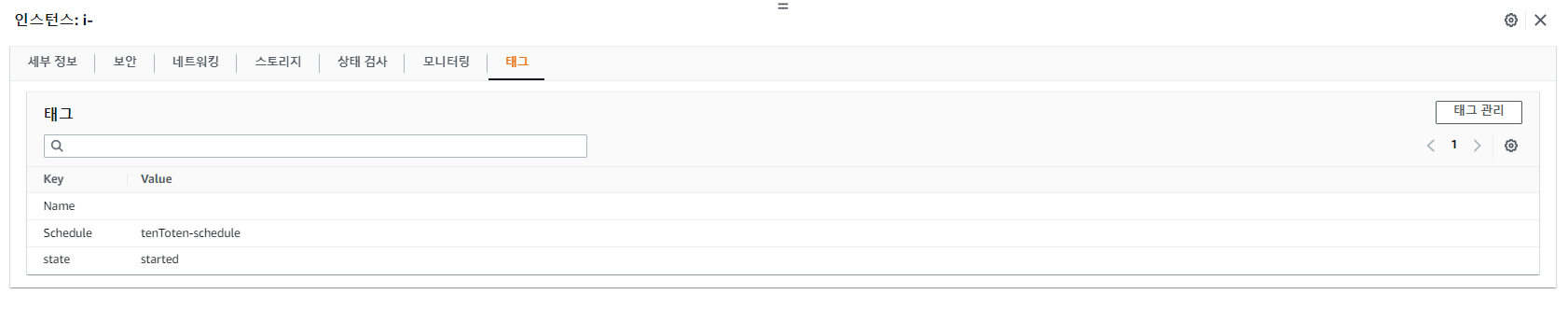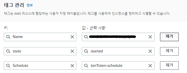 인스턴스 태그에 키에는 config 항목에서 봤던 tagname인 Schedule을 적어주고 값에는 schedule 항목의 name인