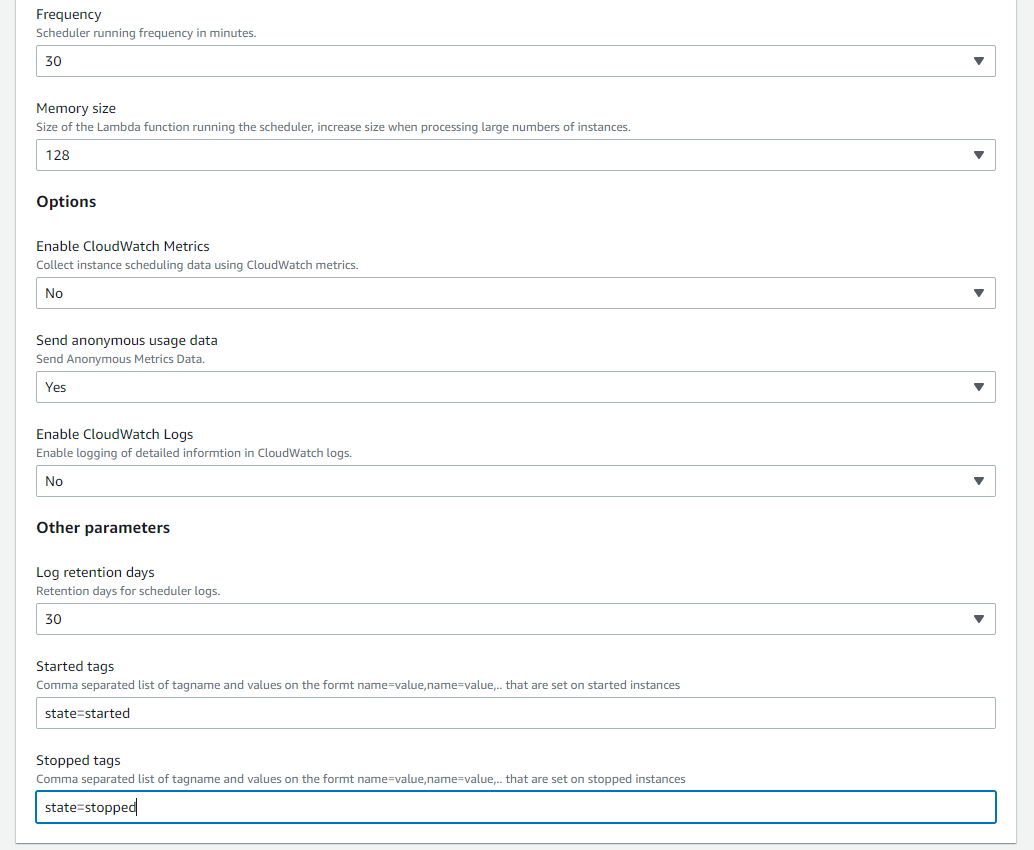 Frequency는 스케줄러가 동작하는 주기를 설정하는 것입니다. 30으로 설정하면 30분마다 인스턴스가 켜졌다 꺼졌다 하는데 실제로 우리는 원하는 시간대를 설정하여 스케줄러를 적용할 것이기 때문에 신경 쓰지 않아도 됩니다.
