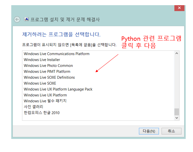 저는 이미 Python 관련 프로그램을 삭제한 상태이기 때문에 사진에 나오지 않습니다.