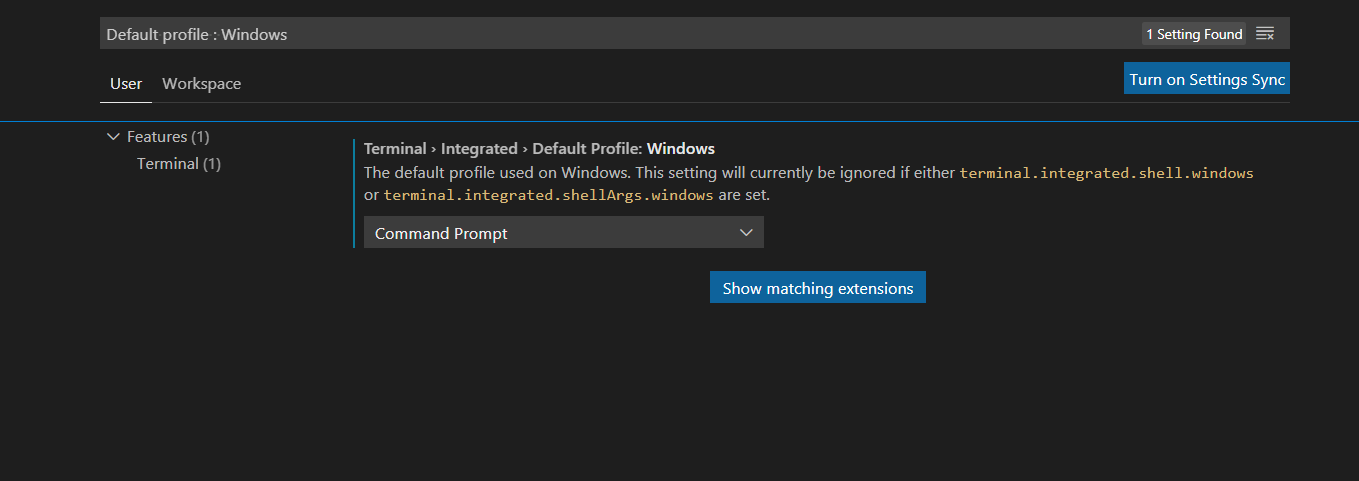 2. Terminal - Integrated - Default Profile : Windows - Command Prompt 클릭